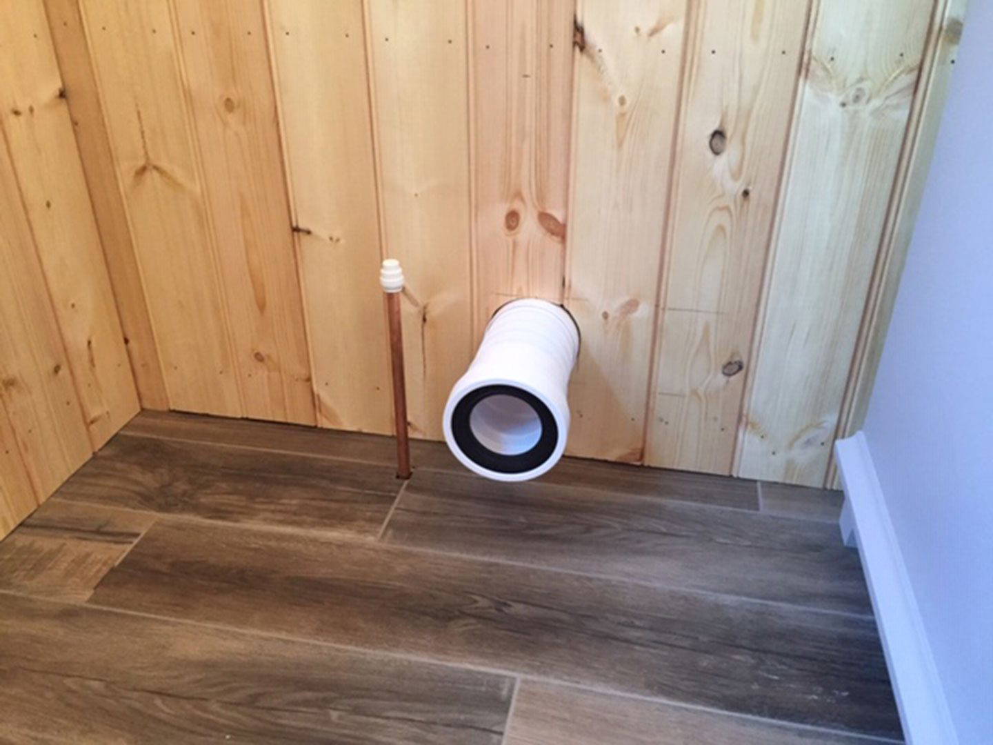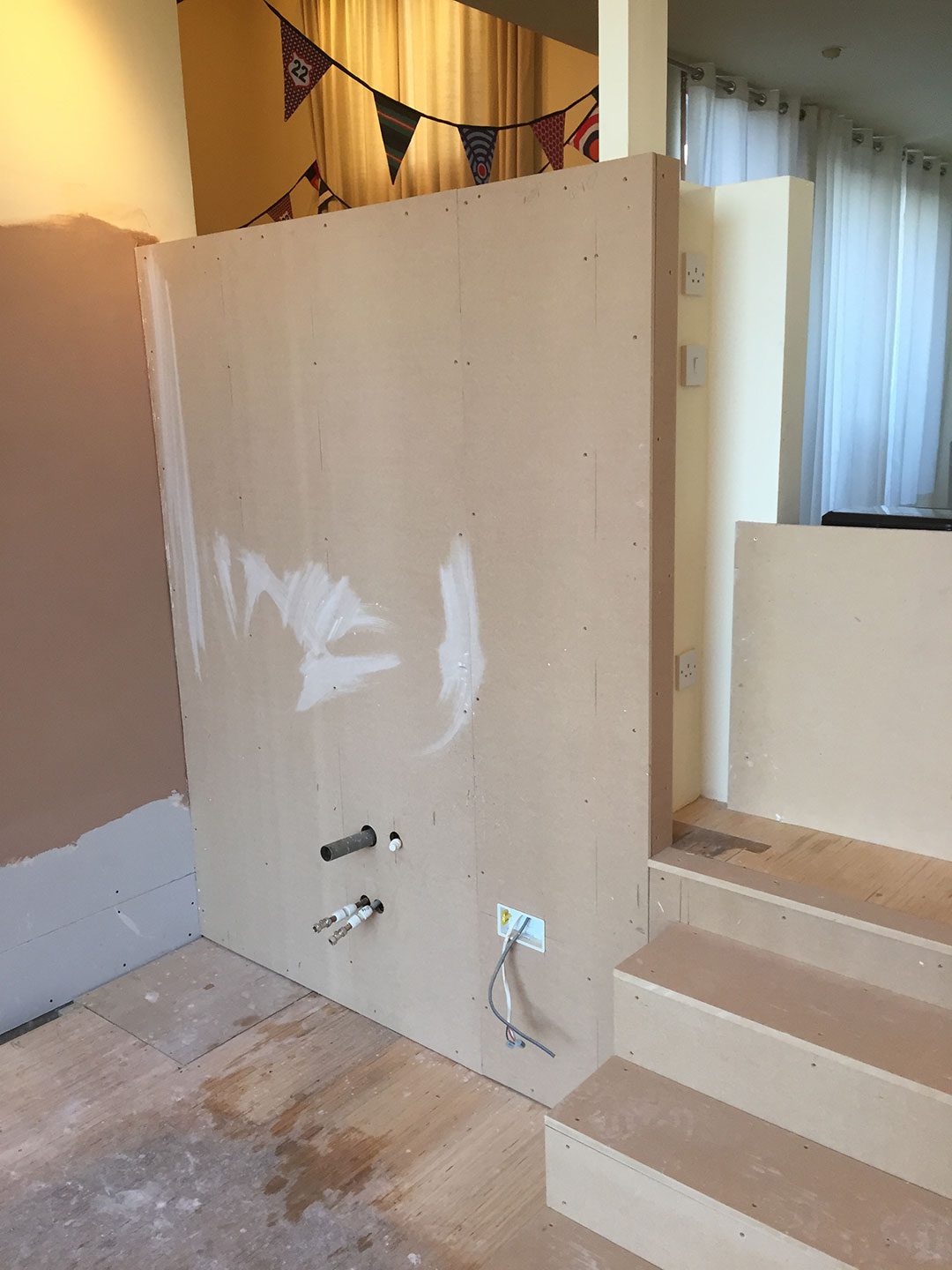Panelling firmly fixed and cut around services/pipework run down in size and planed to suit areas corners and to suit dimensions of window. All rough edges sanded. A 60mm solid timber pine bullnose moulding was cut, prepared, mitred, sanded and fixed to finish the top edge. A solid 150mm pine Ogee skirting was also cut, mitred, sanded and fixed to finish the bottom section. Wooden steps custom built on site in 18mm MDF to provide access between an area in the property with two different levels, plus a stud partition wall also built to provide a divide between two areas.