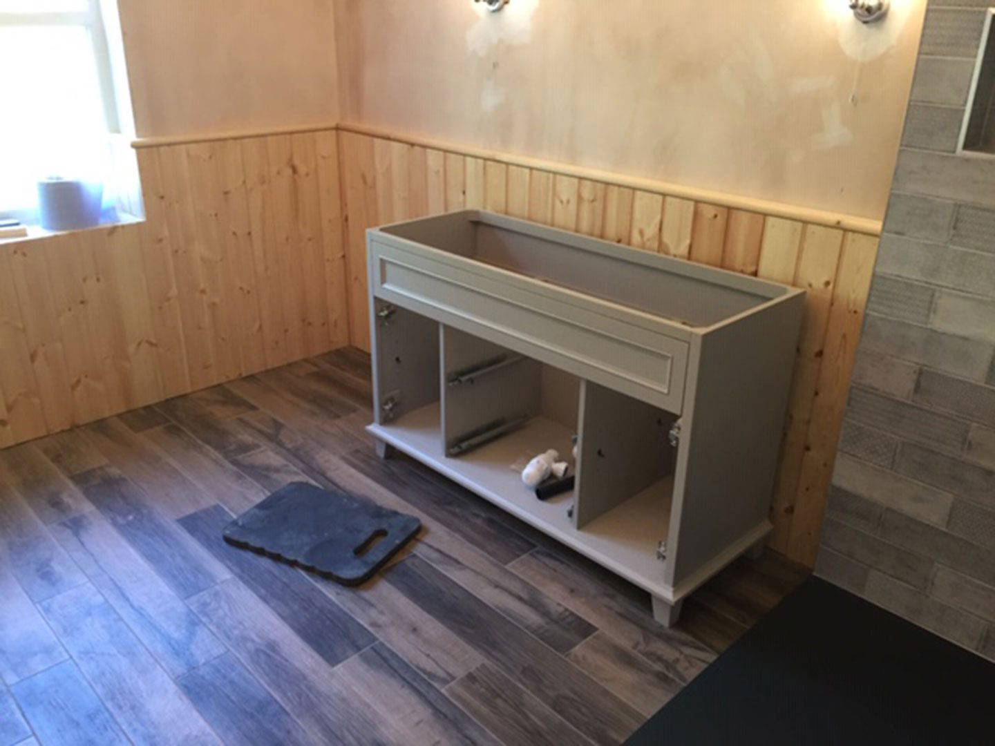 Timber wood panelling required to bathroom walls, finished with skirting boards and trims. Wooden steps and a stud wall built to access an area with different levels. Hang a door with its door furniture.
