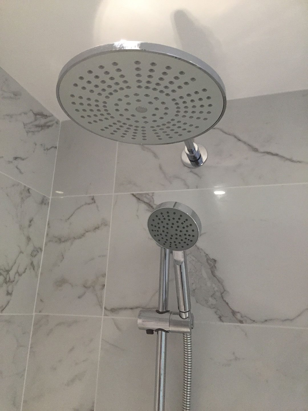 Along with a custom built solid timber plinth we also built two false walls in timber at each end of the new shower tray to close the gap so after the area was tiled a new glass shower enclosure with sliding doors could be attached to the new false walls to provide a solid water proof environment. A new 2-way thermostatic concealed shower valve was carefully plumbed inside one of the false walls with all the correct distances adhered too. This particular shower valve had a separate handset and a fixed shower head. After pressure testing all the pipework, the false walls were closed up with a moisture proof 12mm plaster board.