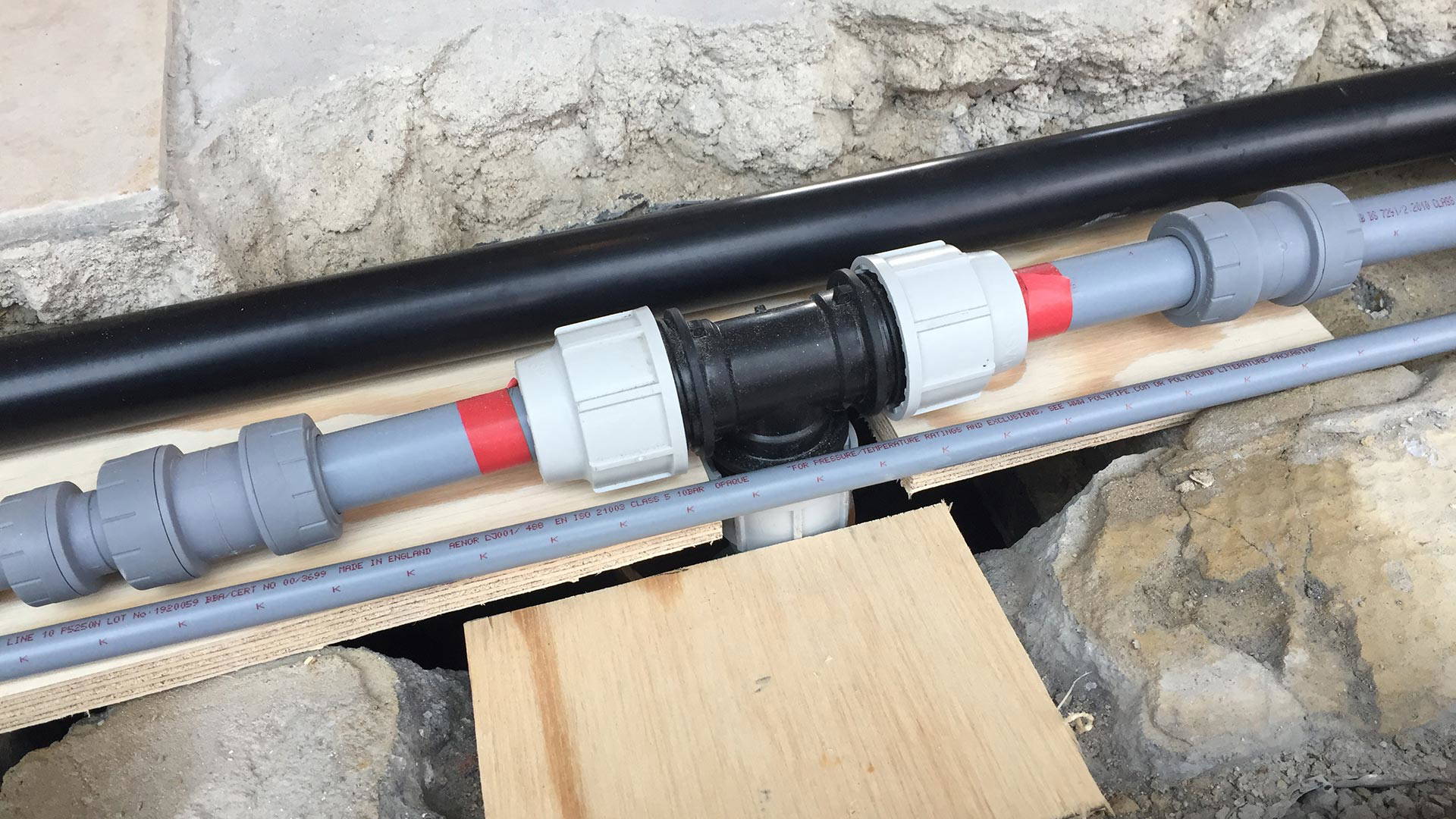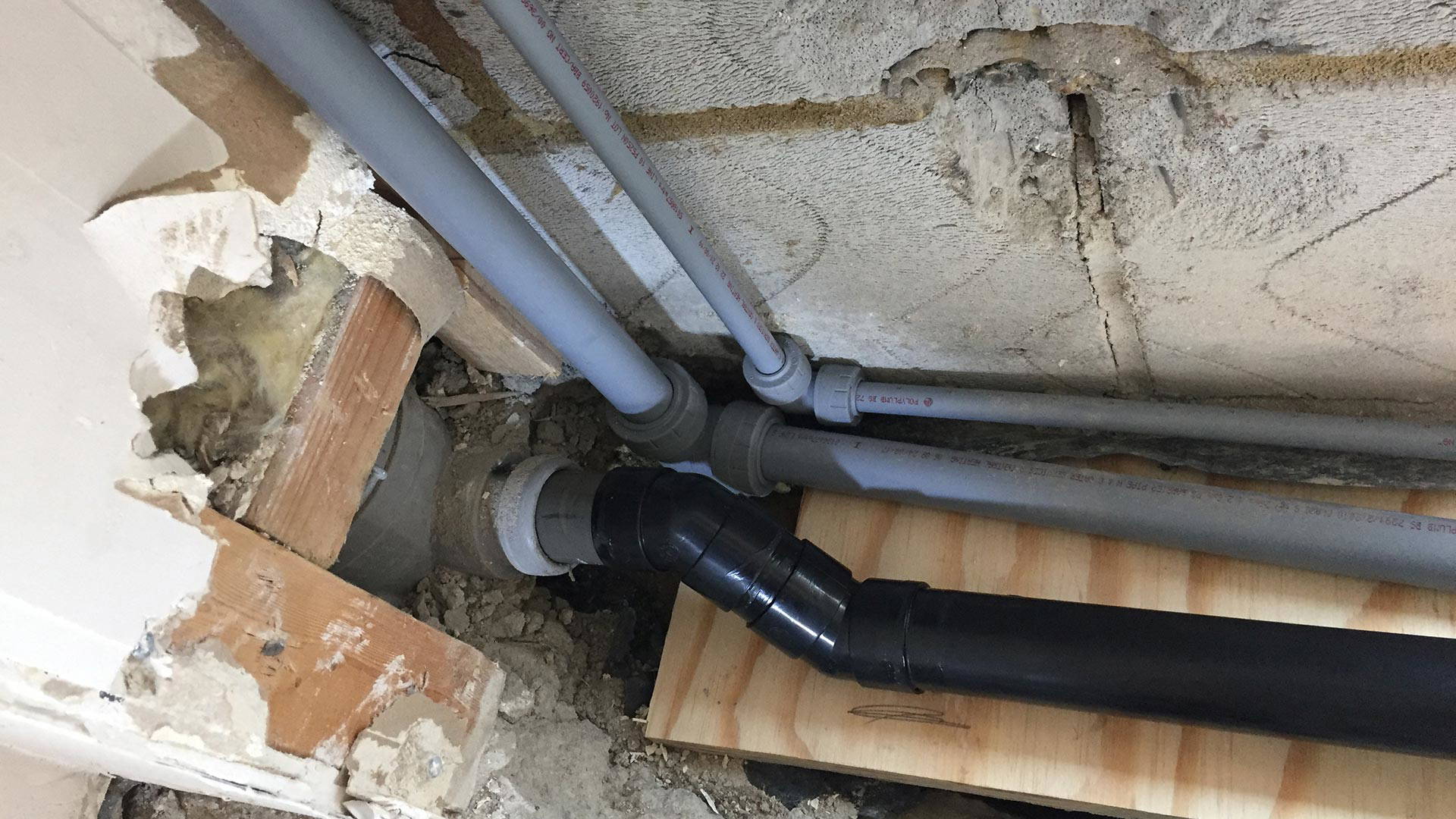 To open up the solid concrete floor and gain access to the pipe-work via the solid block and beam subfloor. Open chases were made in either direction to new kitchen sink unit positions and to services from upstairs. Existing plastic 110mm soil stack exposed at below block and beam subfloor level with an access made so a new 100mm strap on boss could be drilled, glued and a new connection made to carry waste waters from new kitchen appliances with a natural gravity fall.